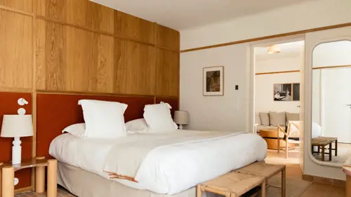 Esta amplia suite aúna confort con relajación, como un soplo de aire fresco. En ella podrá disfrutar con toda su familia la experiencia de la Provenza. A un lado, la salita, el sofá-cama y el baño con bañera. Al otra, una estética contemporánea (sosegada, limpia y delicada) que funde los tonos blancos y los ocres con muebles de mimbre, cerámica de artesanos locales y libros que reivindican la región. Inmersión garantizada.